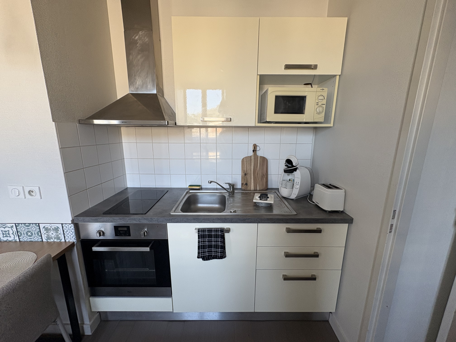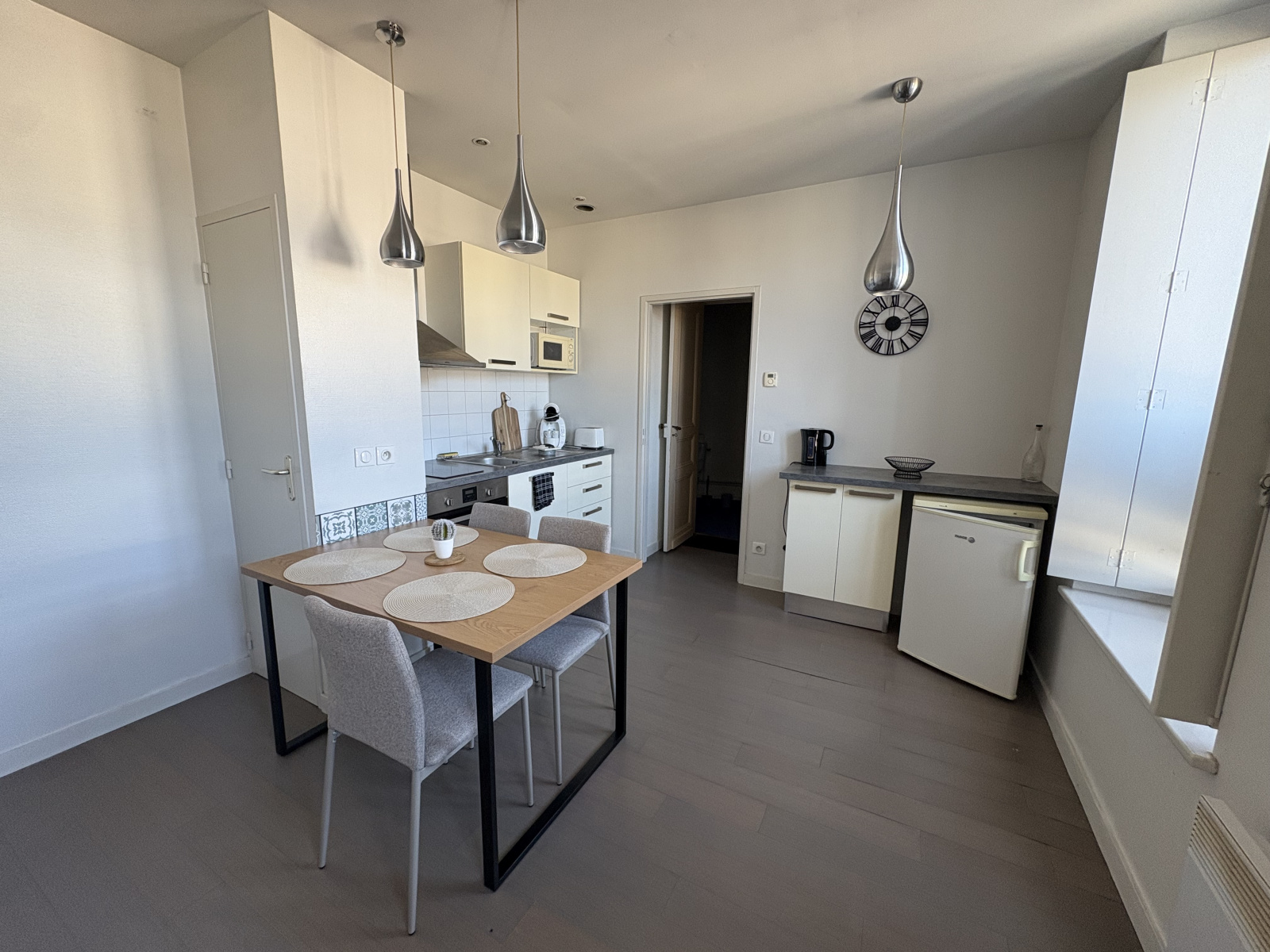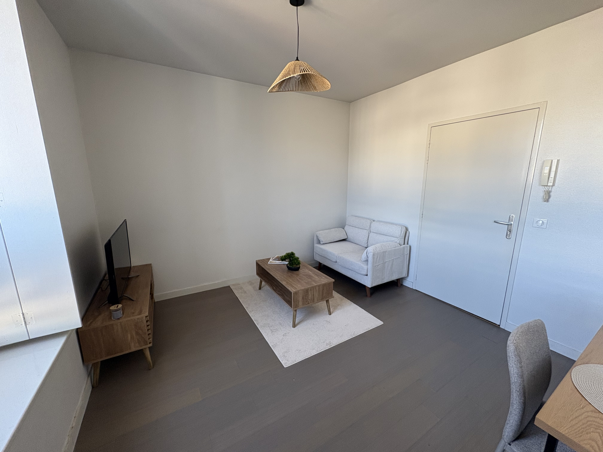 Le logement comprend : un grand salon ouvert sur une cuisine équipée, une salle d'eau avec wc et une petite pièce pouvant faire office de chambre.
