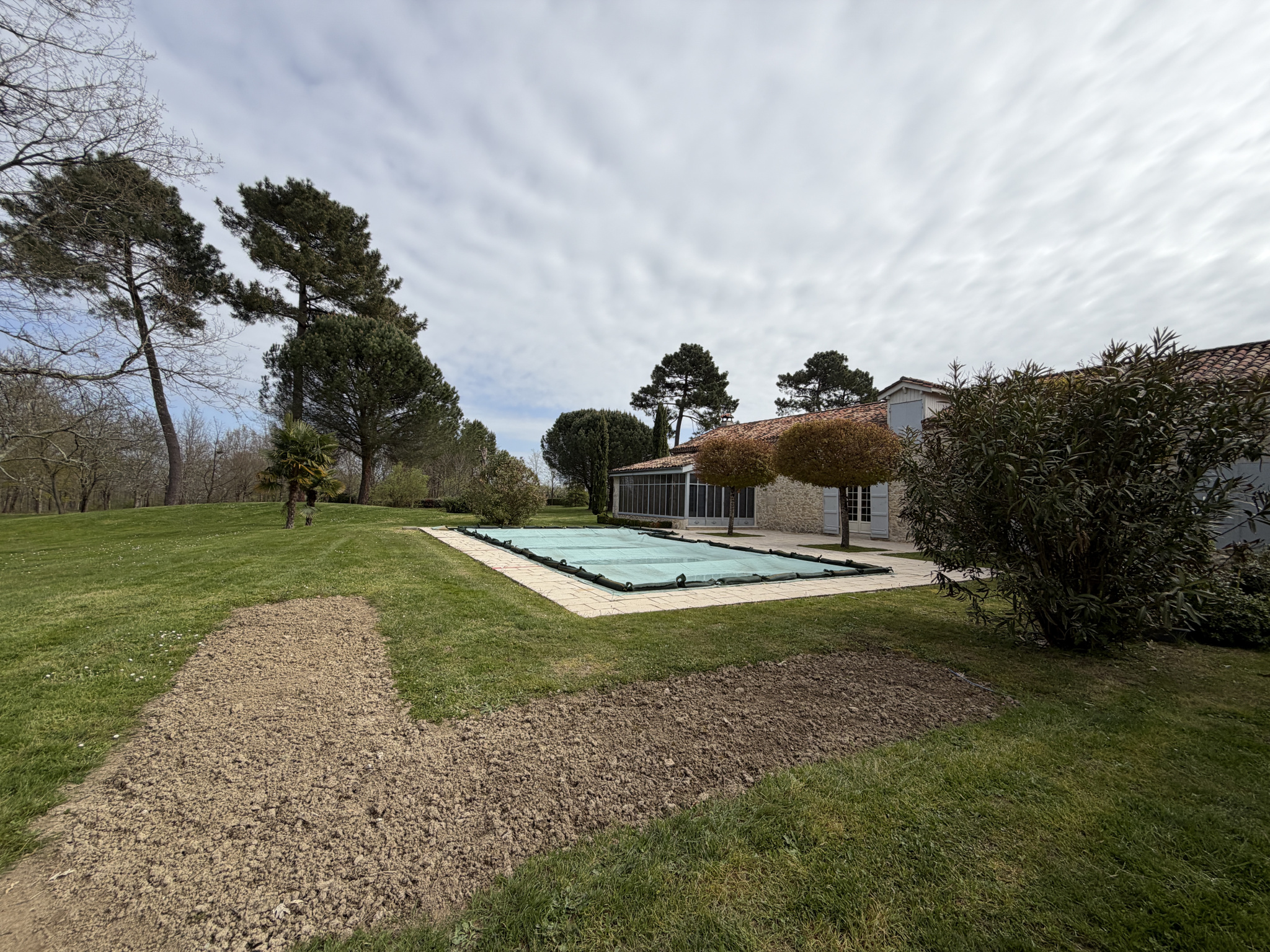 En extérieur,un terrain entièrement clôturé, comprenant une piscine, une grande mare, un hangar de stockage ainsi qu'un boulodrome.