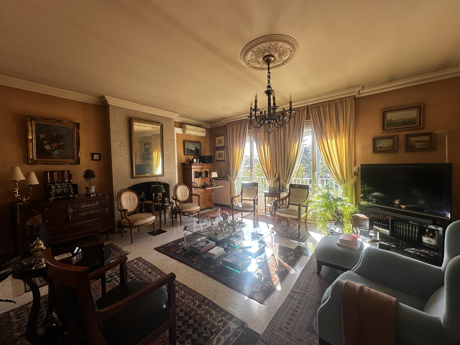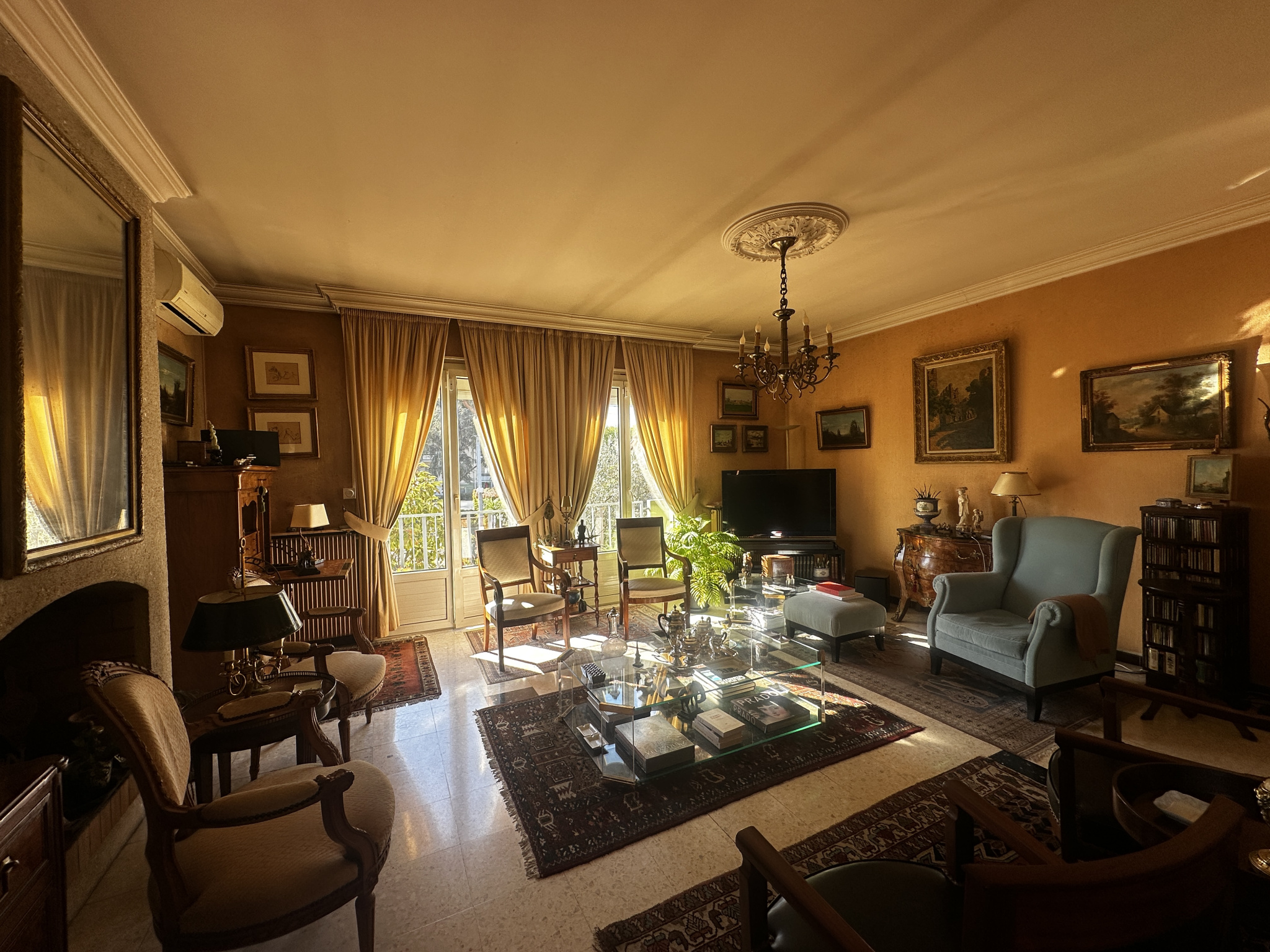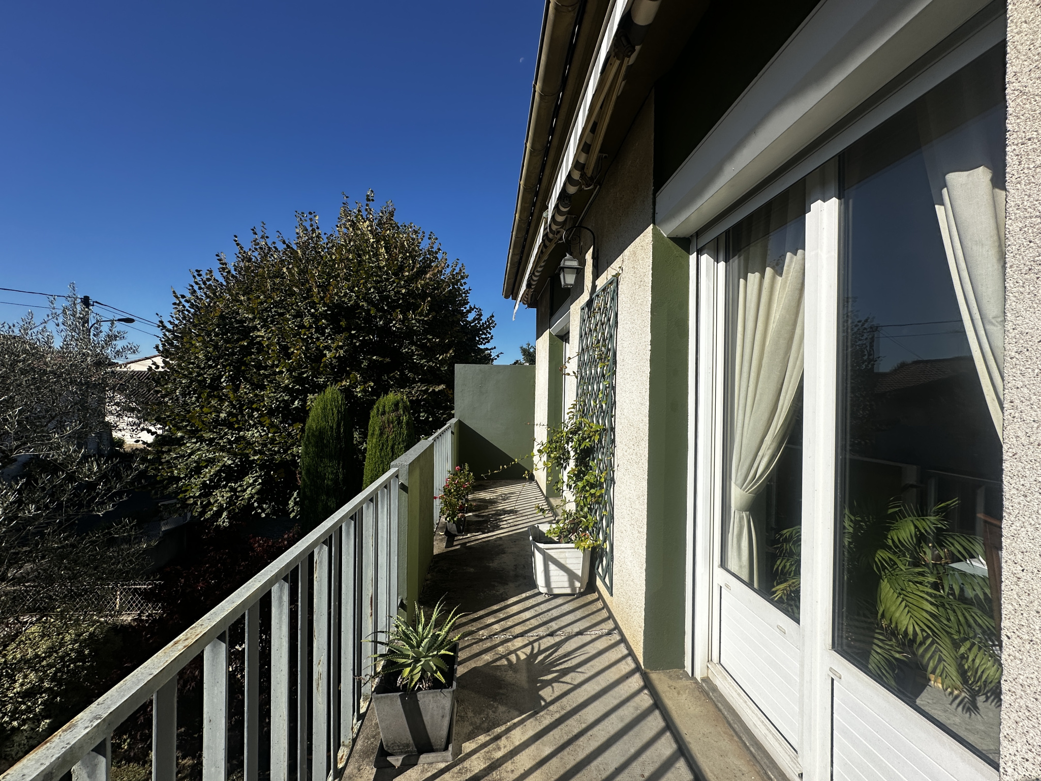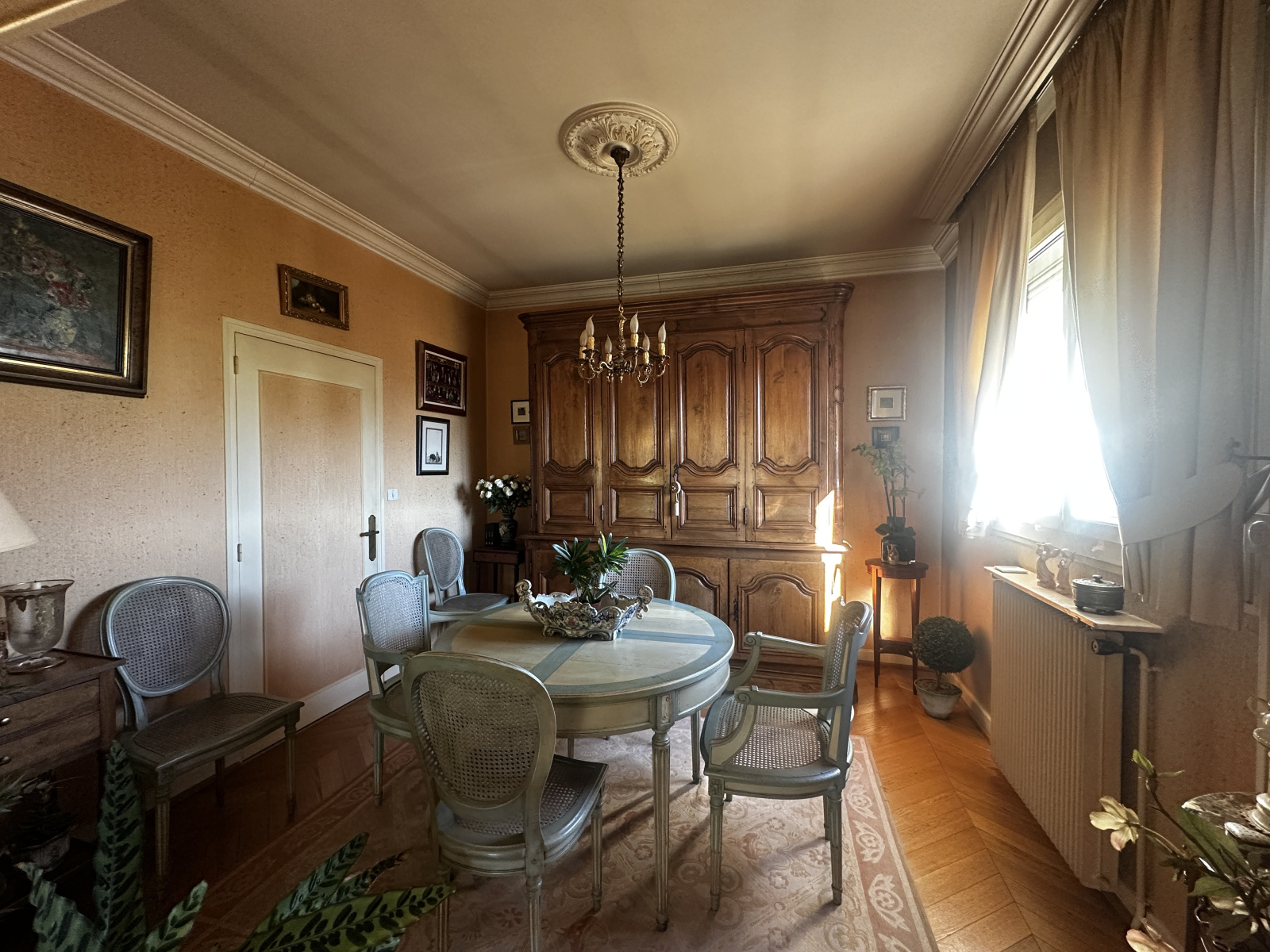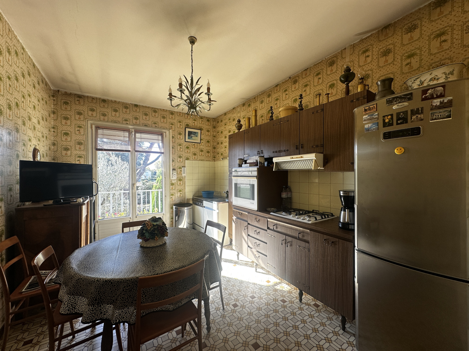 À l’étage, le palier dessert une cuisine indépendante (d’origine, à moderniser) et un séjour lumineux exposé plein sud, composé d’un salon avec cheminée et d’une salle à manger ouvrant sur un balcon filant équipé d’un store banne — parfait pour profiter du soleil en toute saison.