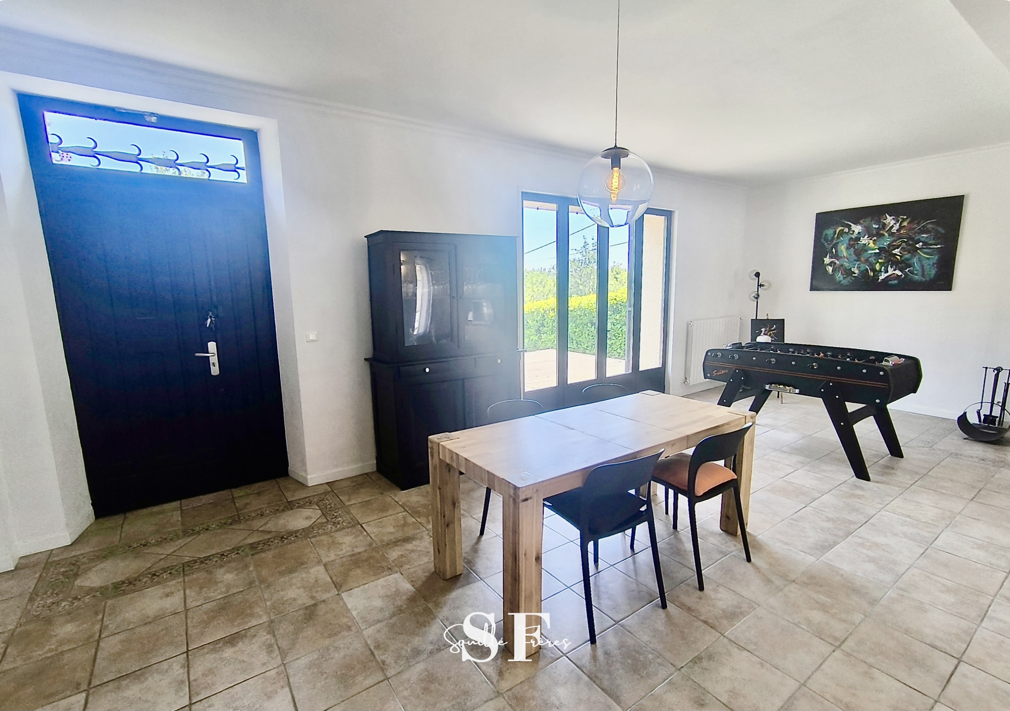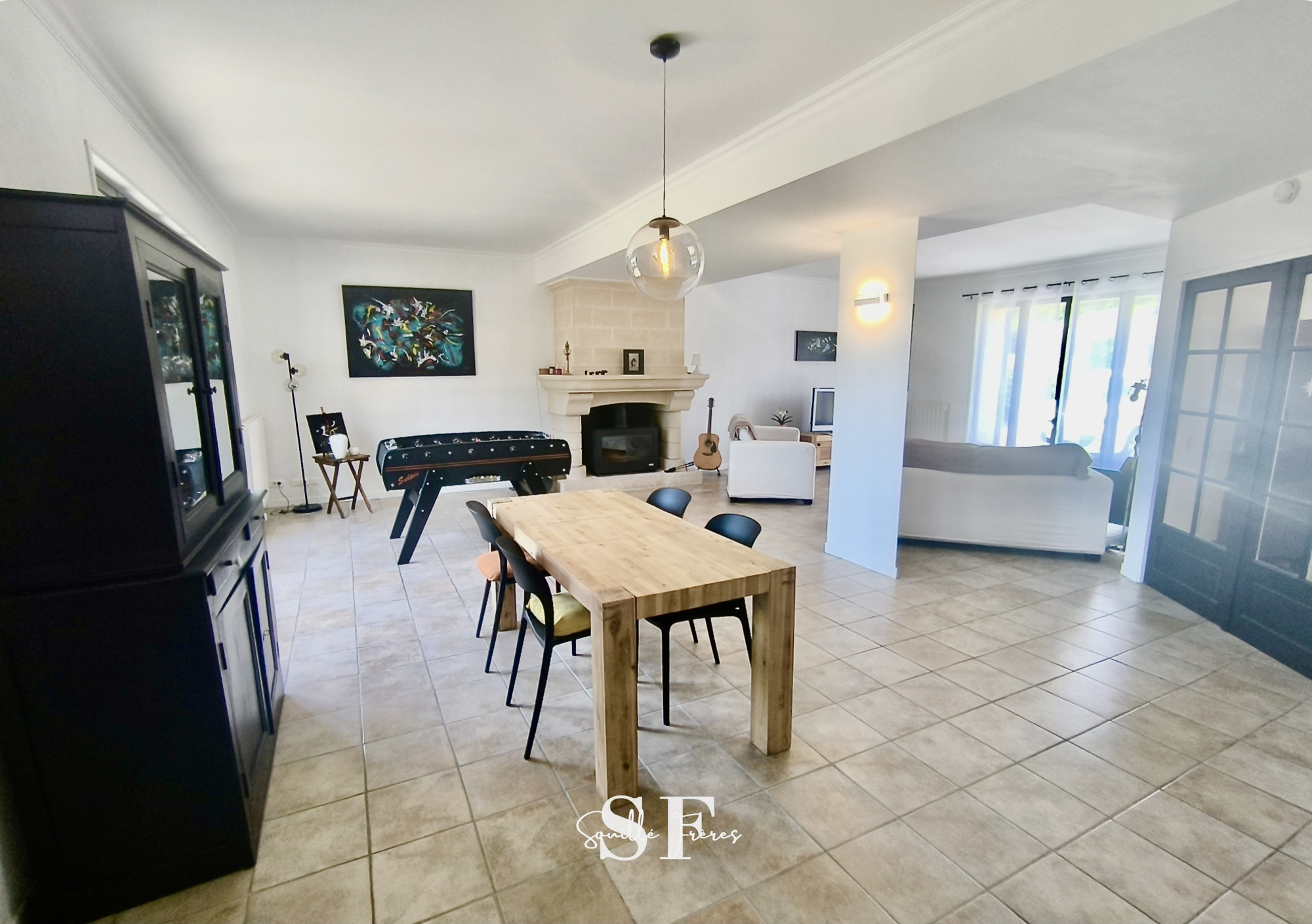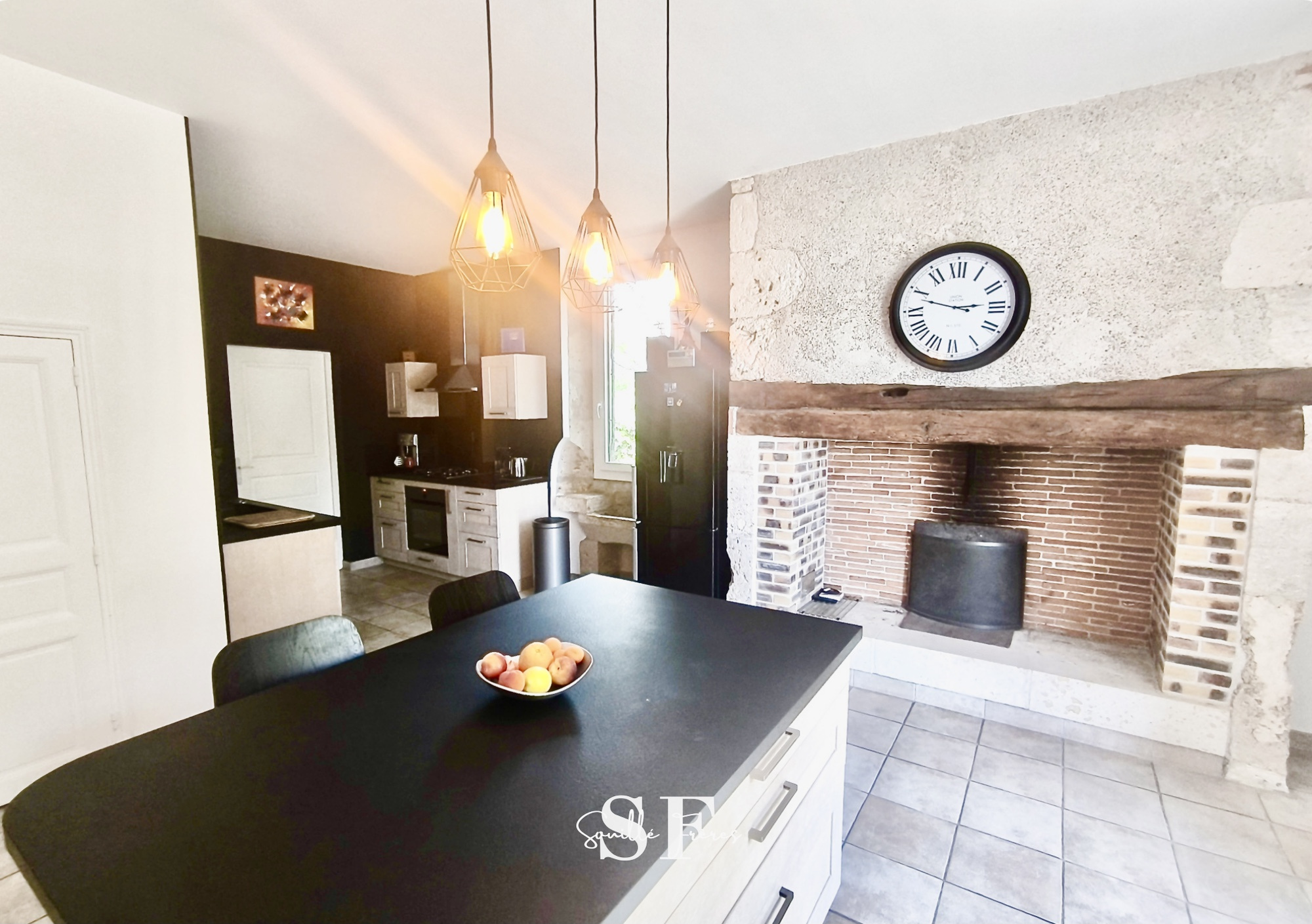 La maison principale de 265m² environ offre une vaste entrée,un wc avec point d'eau, une cuisine avec une authentique cheminée en pierre, attenante à celle ci: la buanderie ainsi que le cellier. Un salon-séjour de plus de 60m² avec poêle à bois, lumineux et donnant accès direct sur terrasse et jardin.
