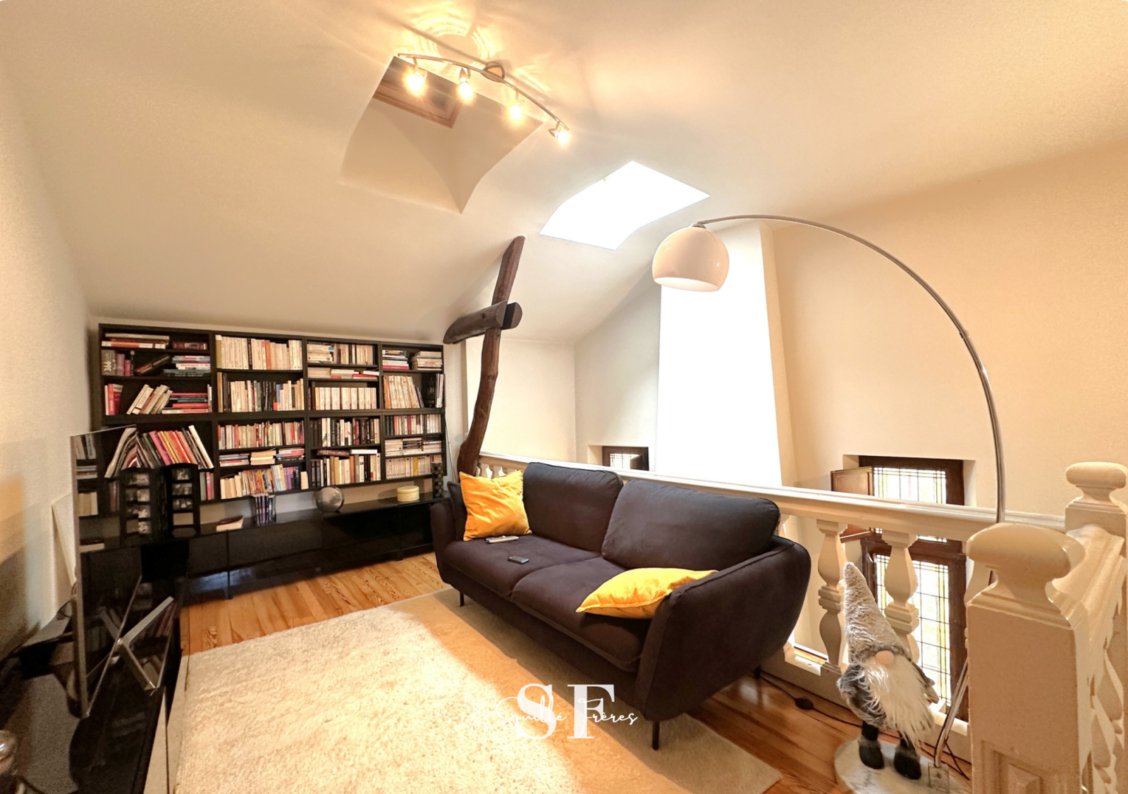 A l'étage du dessus, une mezzanine chaleureuse aménagée en coin vidéo/lecture dessert une 5e et une 6e chambre, dont une avec salle d'eau et possibilité de dressing indépendant, un dégagement avec rangements au bout duquel on accède à une grande salle de jeux mansardée qui ravira les plus jeunes.
