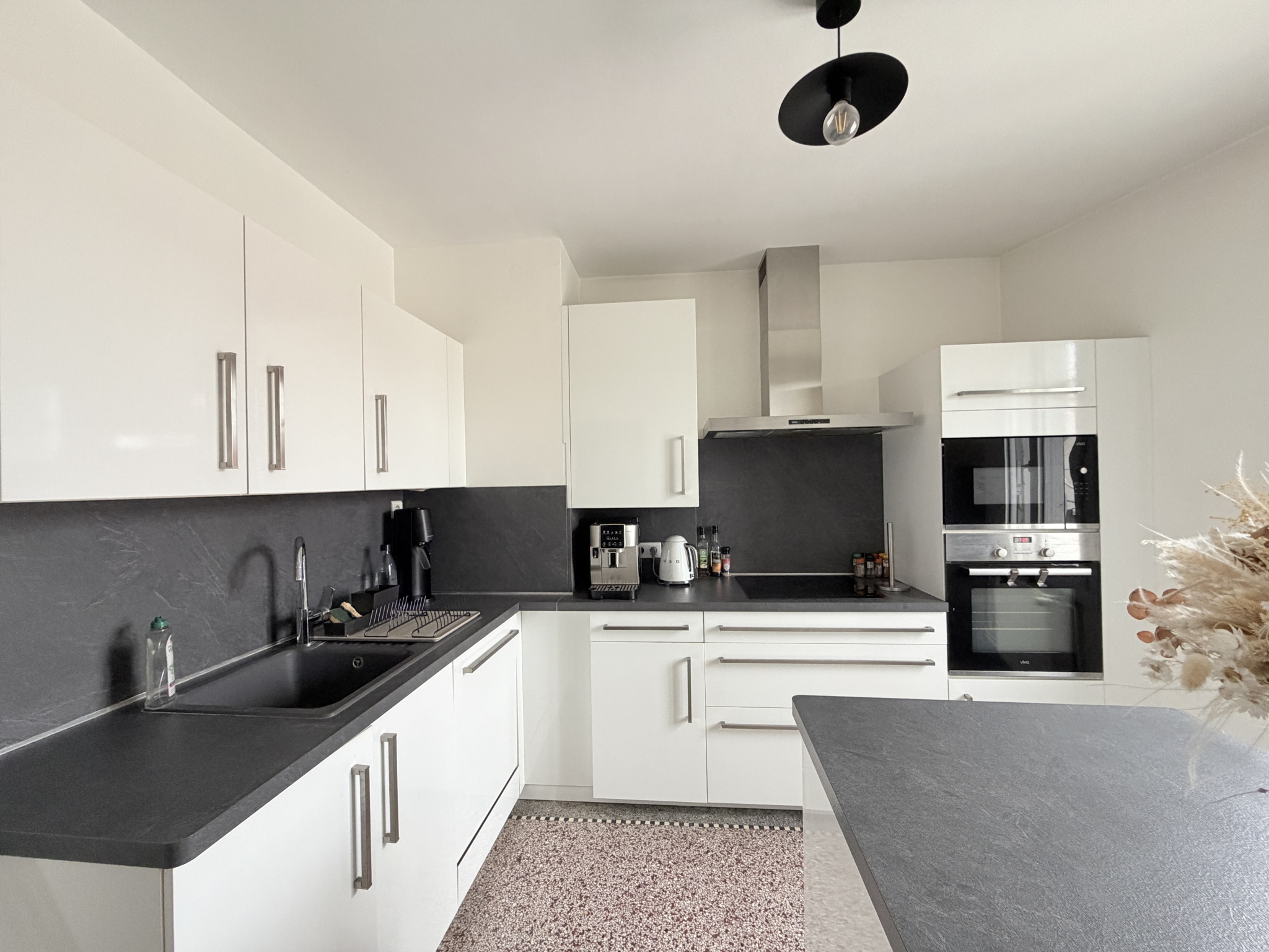 Elle s’ouvre sur un placard intégré et mène vers une cuisine moderne, entièrement aménagée et équipée, idéale pour les amateurs de convivialité.