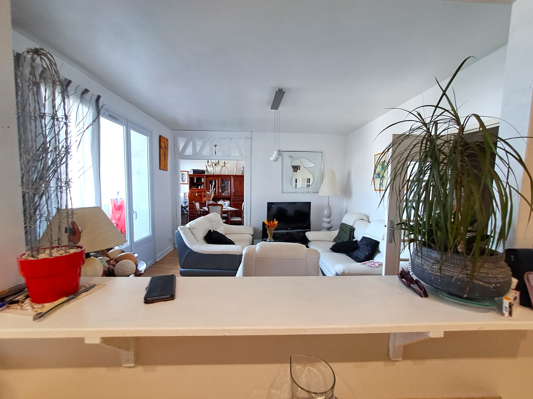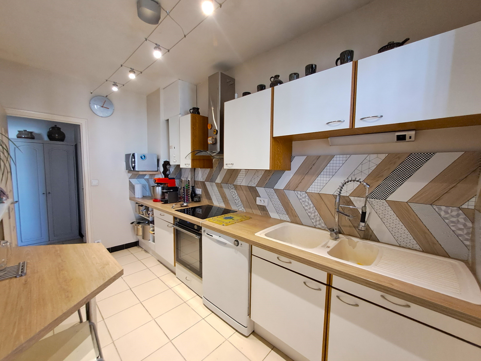La cuisine semi-ouverte s’intègre harmonieusement à la pièce de vie, créant un espace convivial et chaleureux.