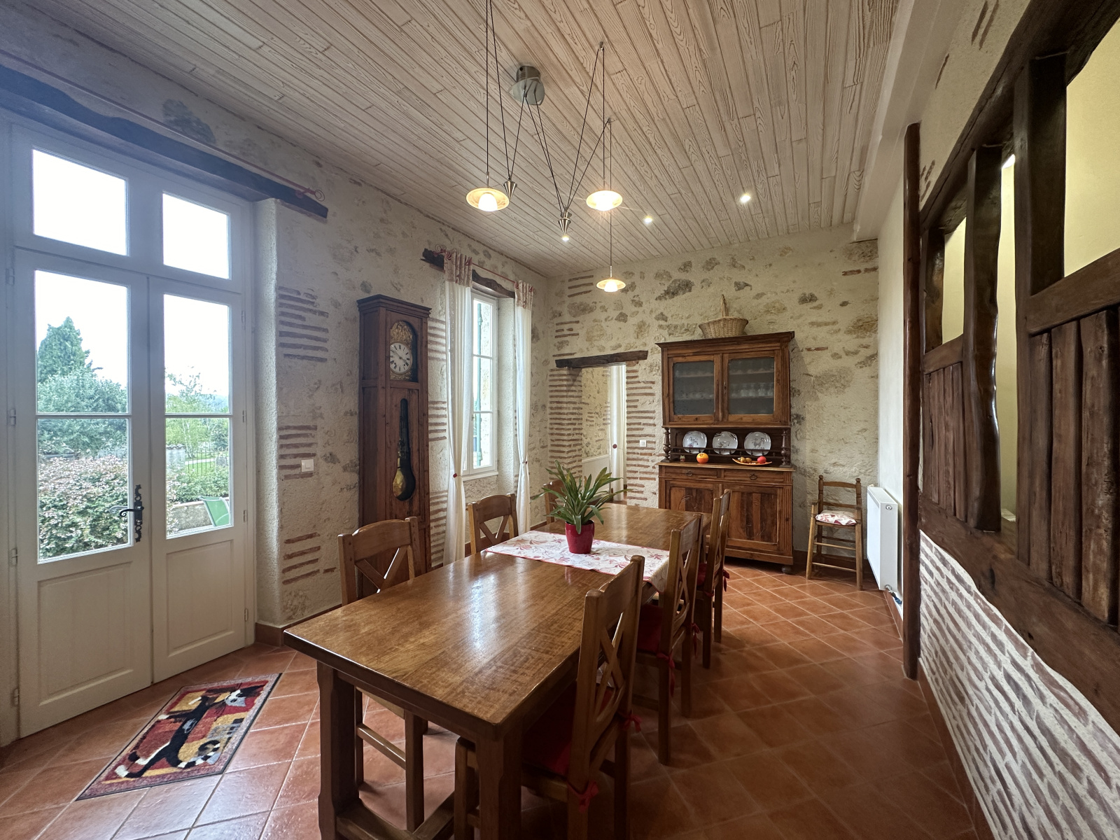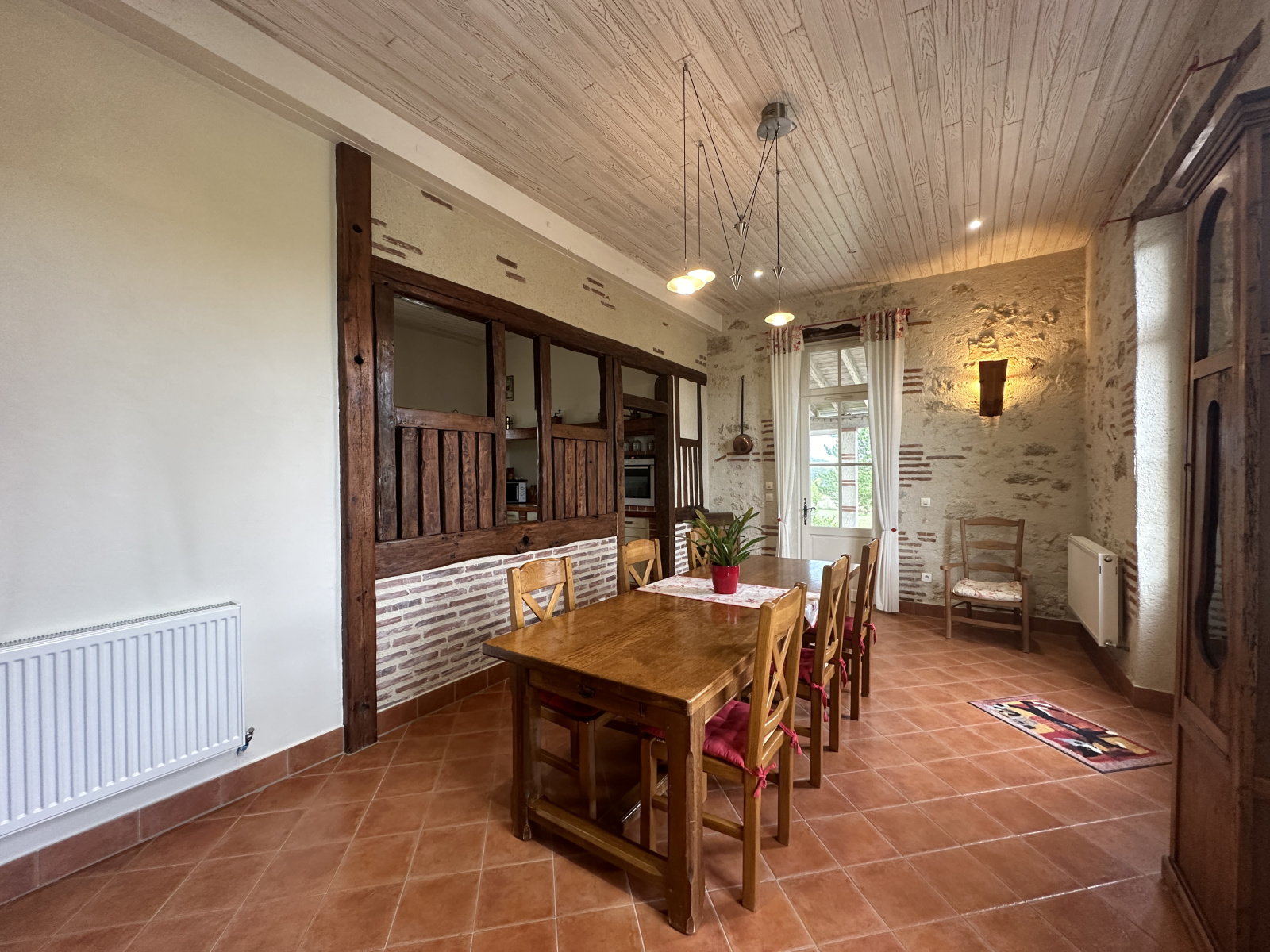 Cuisine ouverte sur espace repas (40 m²) donnant sur une véranda ouverte de 20 m². Vue magnifique sur la campagne.