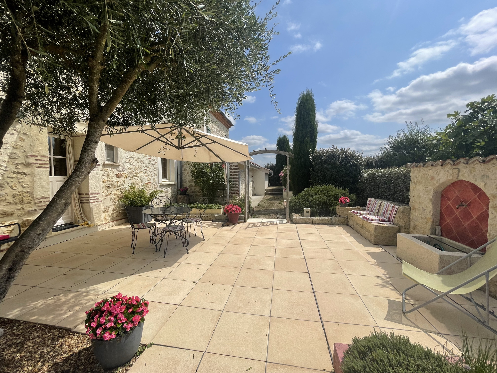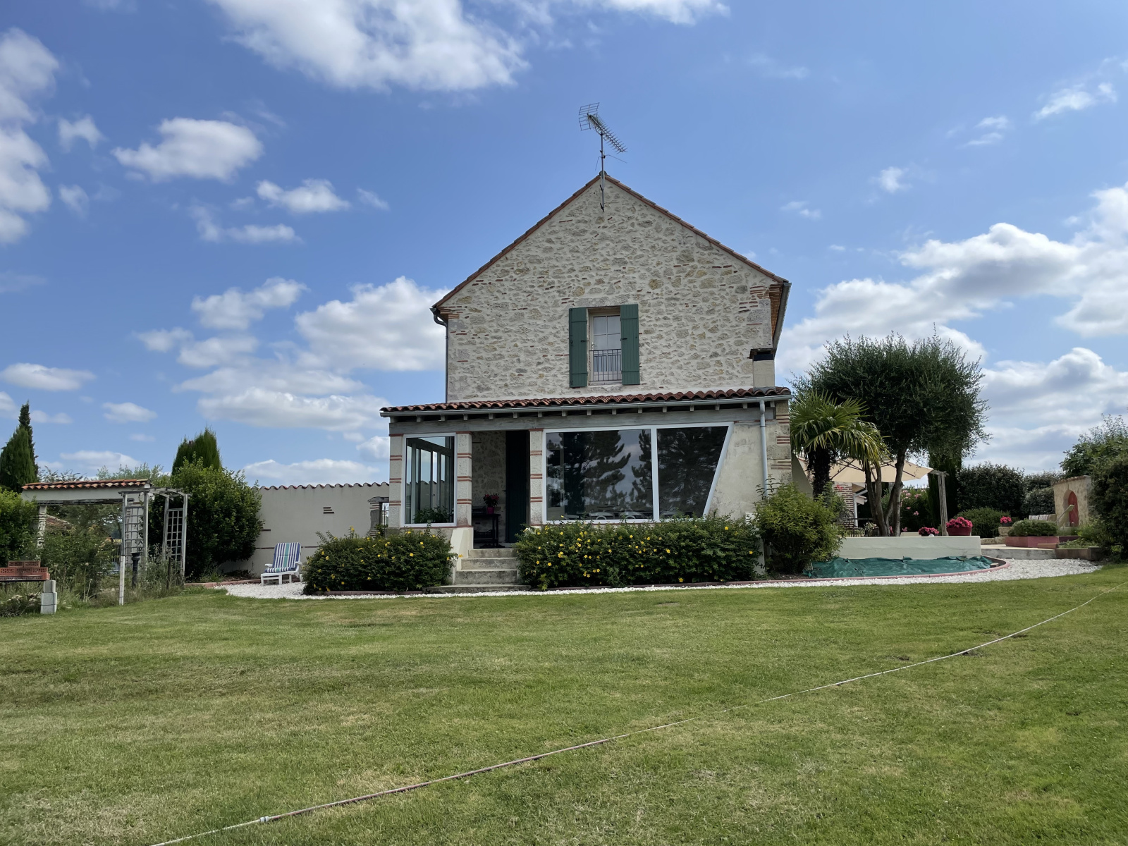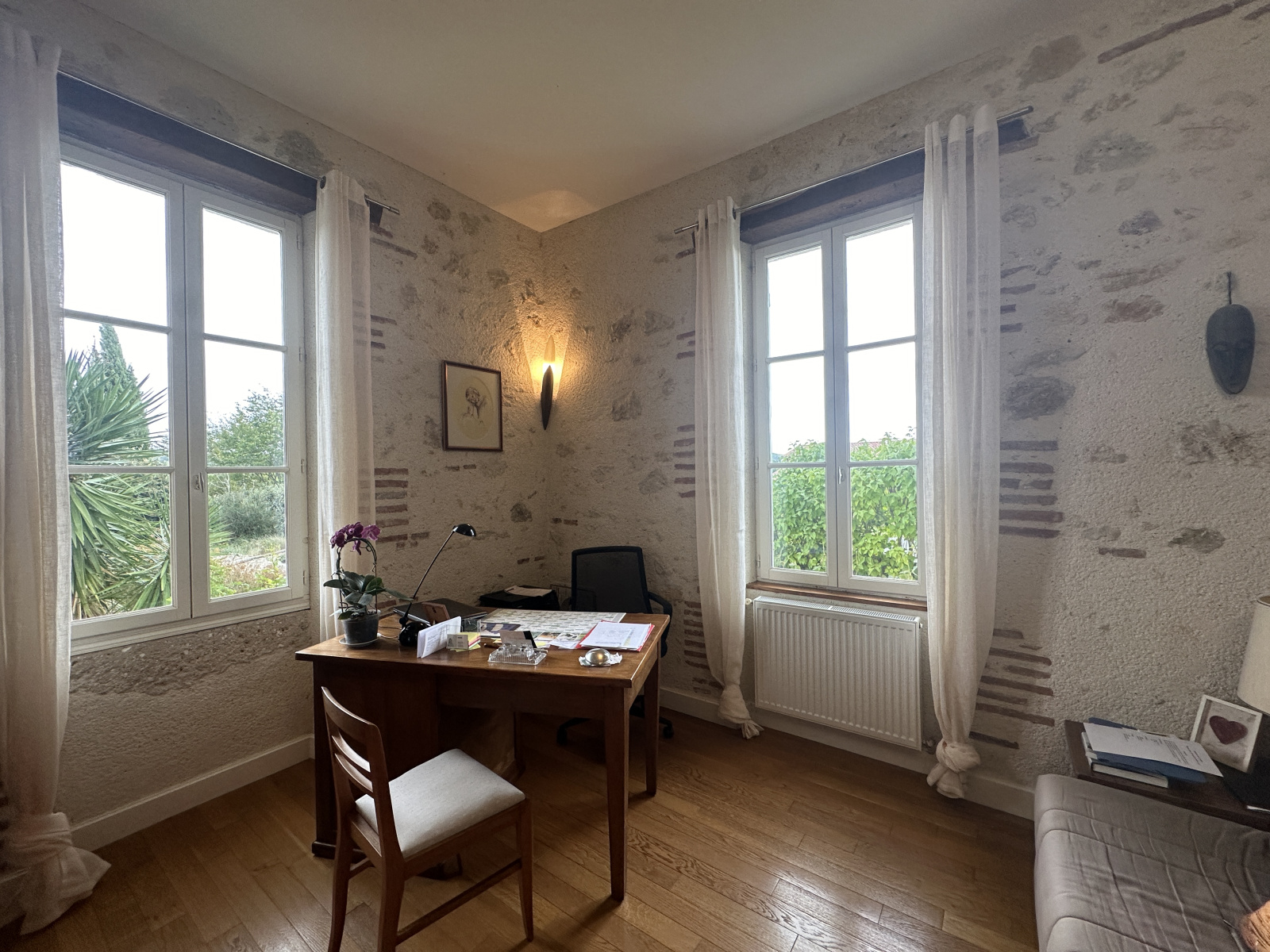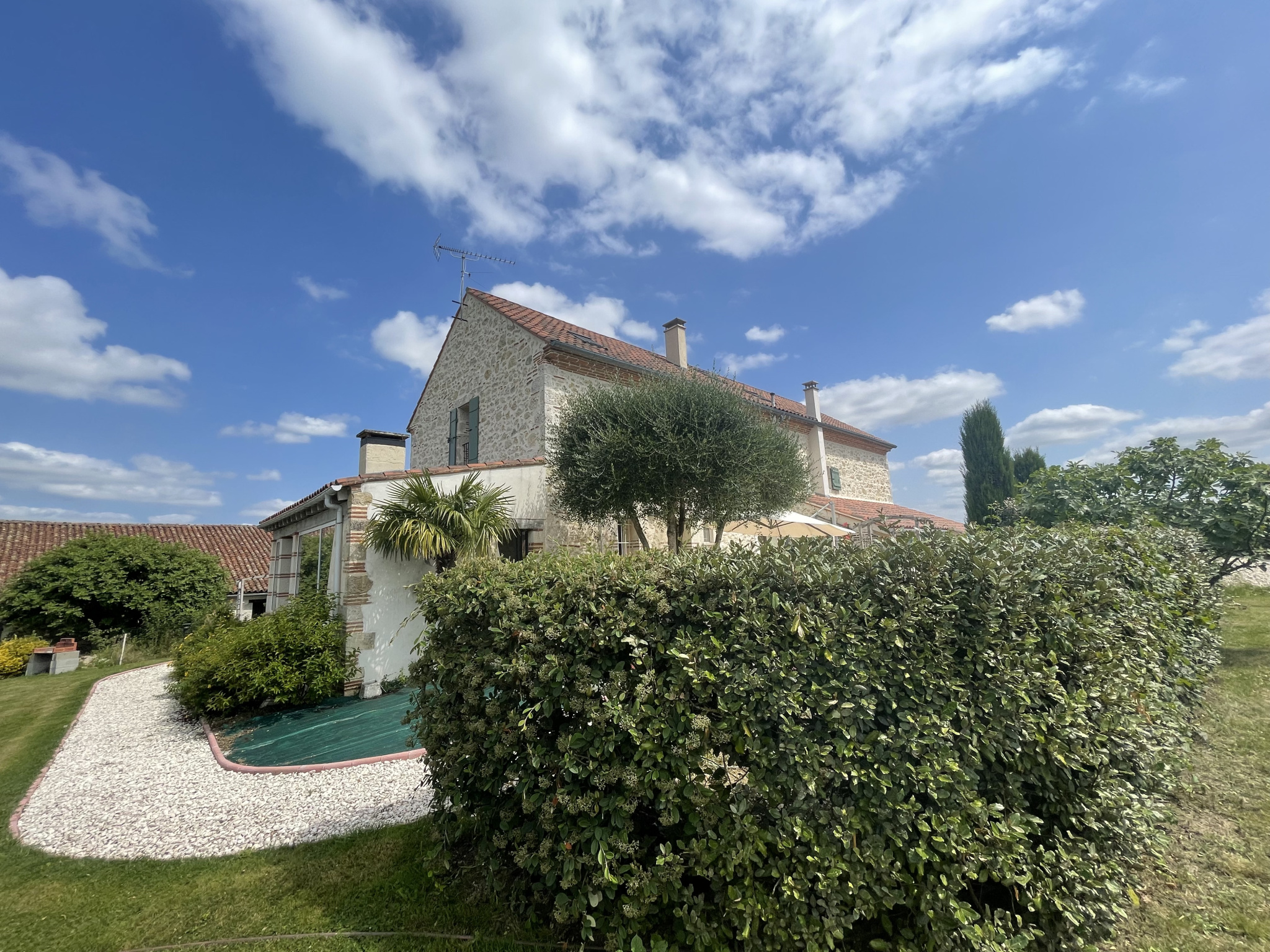 Très belle maison en pierres, implantée sur un terrain de 9000 m², clos et arboré, à la campagne mais non isolée sur une voie sans issue. Vue dominante à 5 min de toutes commodités, à 5 min également de l’échangeur autoroutier.