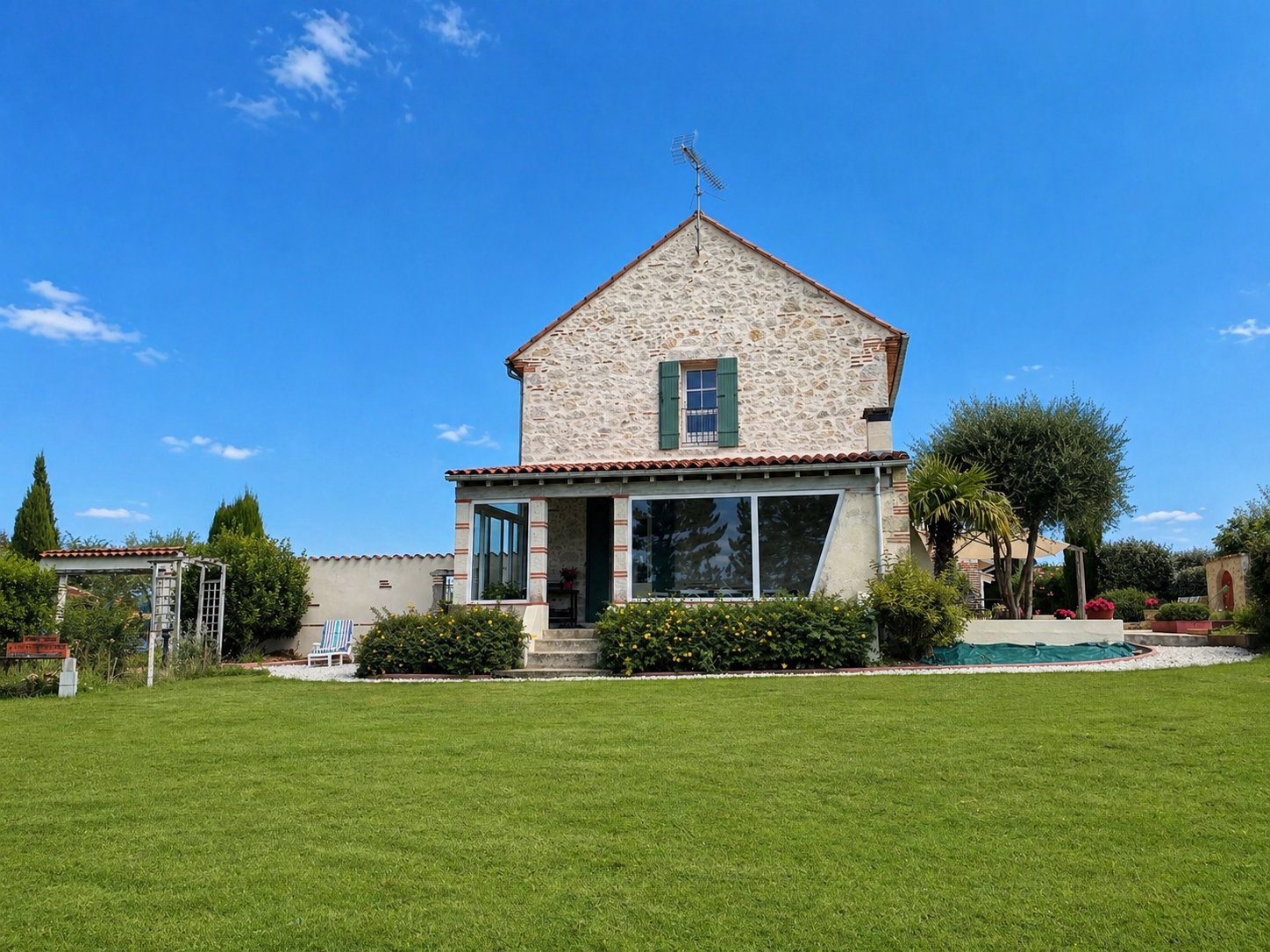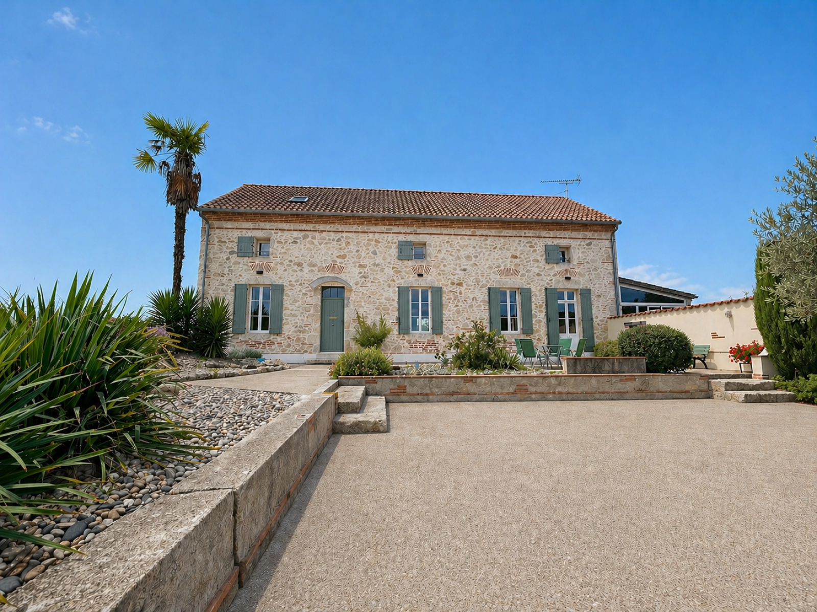 Très belle maison en pierres, implantée sur un terrain de 9000 m², clos et arboré, à la campagne mais non isolée sur une voie sans issue. Vue dominante à 5 min de toutes commodités, à 5 min également de l’échangeur autoroutier.