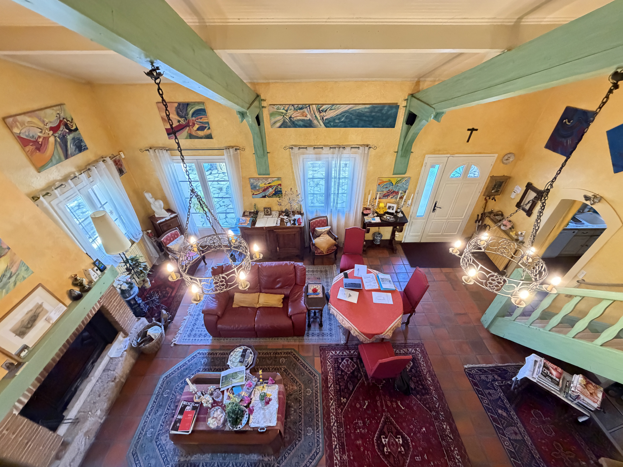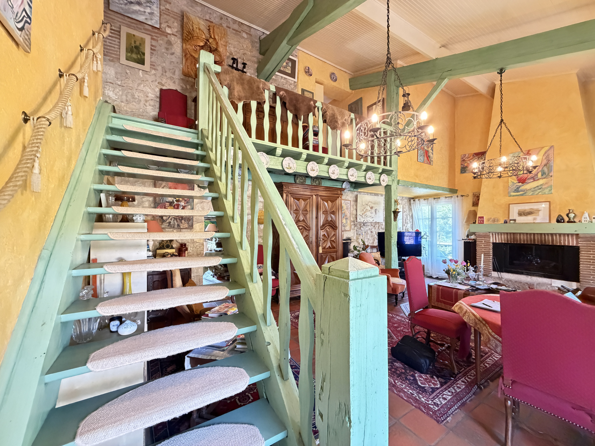 Le rez-de-chaussée accueille un premier salon-salle à manger chaleureux, sublimé par une cheminée, ainsi qu’un second salon attenant, idéal pour recevoir ou créer un espace plus intimiste. Une cuisine indépendante, aménagée et équipée, complète cet espace de vie, accompagnée d’un bureau et de sanitaires.