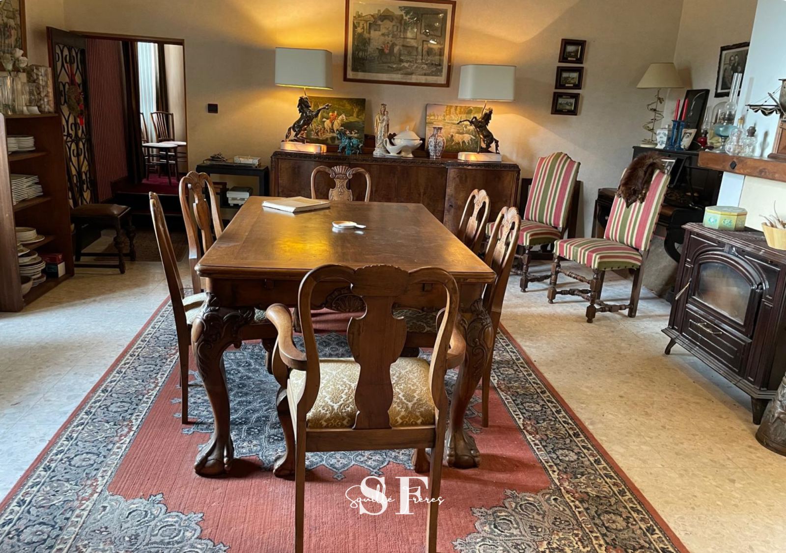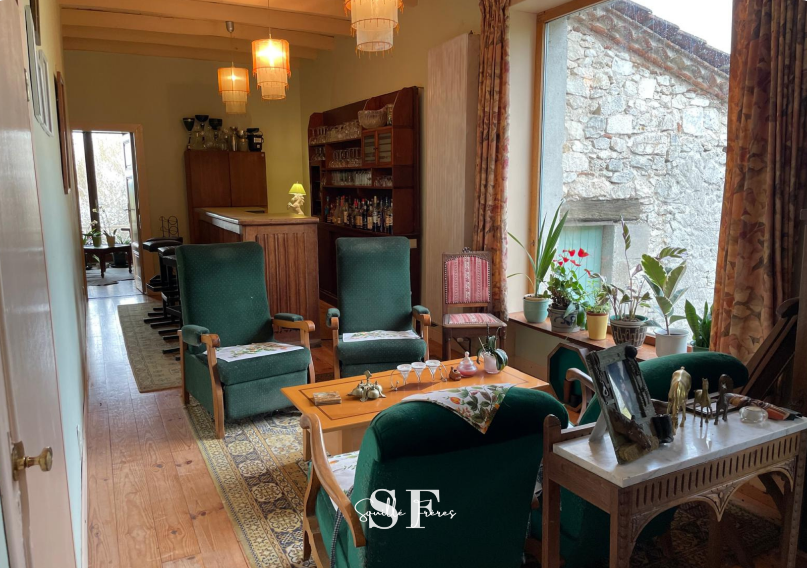 Au rez-de-chaussée: une somptueuse entrée, salon, salle à manger, salon/bar pour recevoir vos convives, cuisine séparée avec sa cheminée authentique, 3 chambres , salle d'eau, wc.