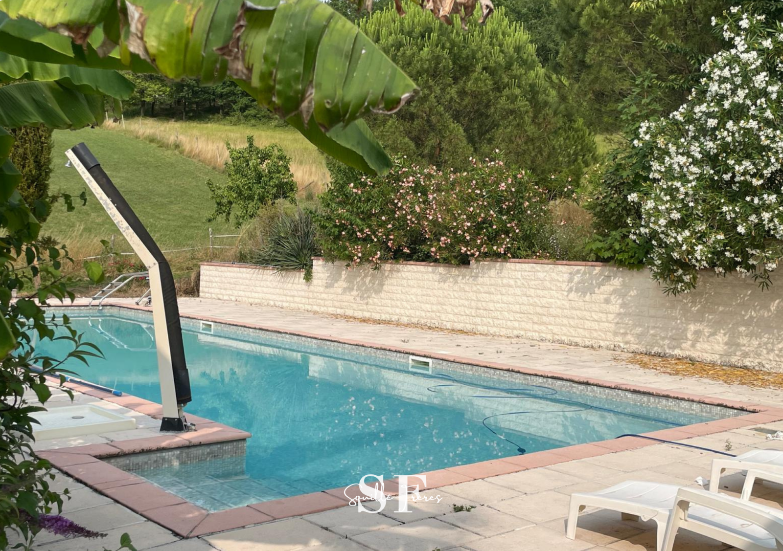 Vous pourrez profiter de l'espace dédié à la détente avec sa piscine de 15m * 5 m, son poolhouse, pétanque, douche, wc.